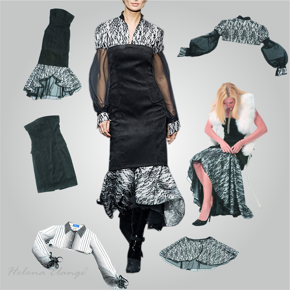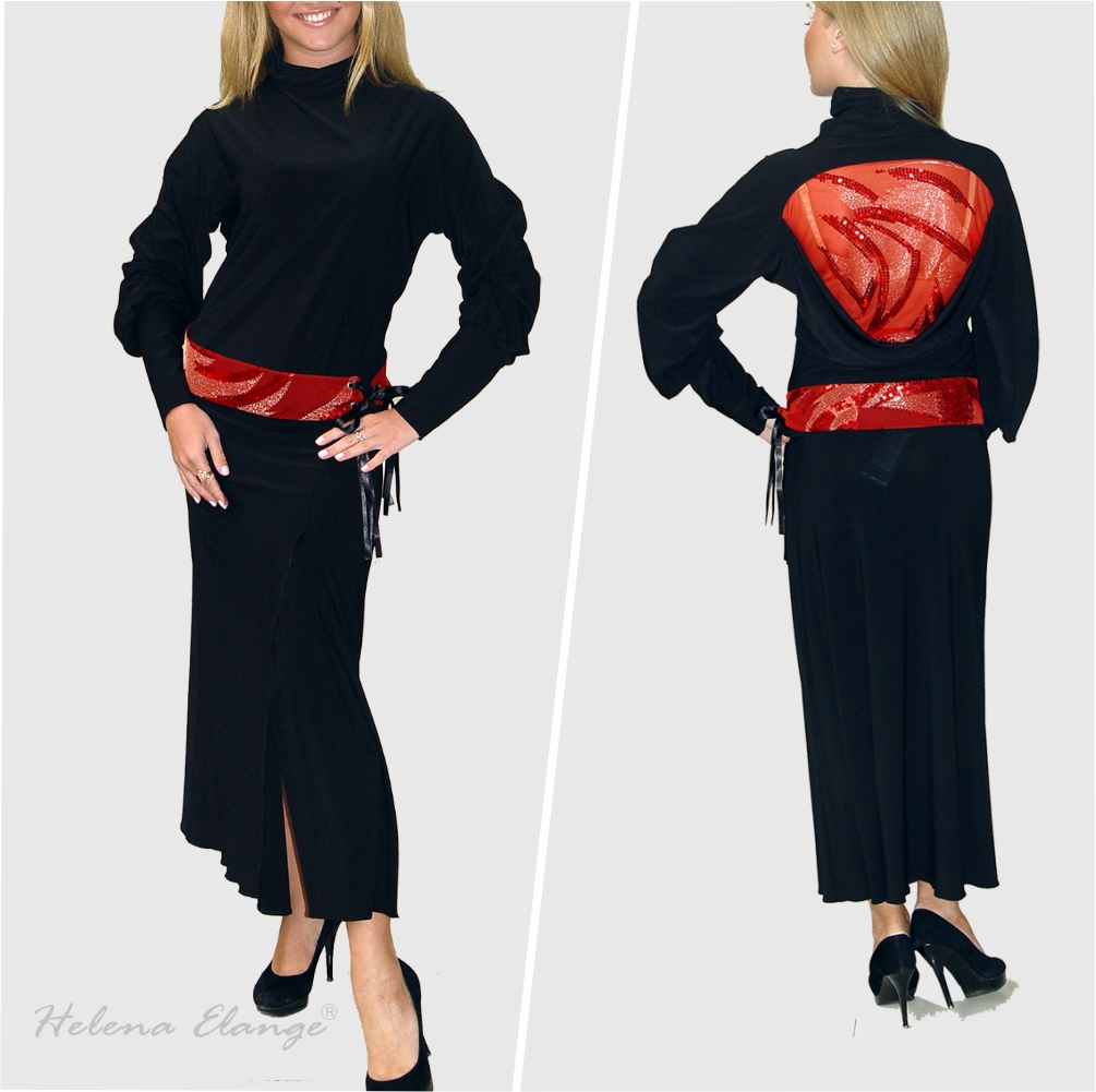 An evening jersey suit consisting of a skirt with an elegant slit, a lace belt, a blouse with long sleeves and a wide cuff. The blouse can be combined with jeans to create a different party style.